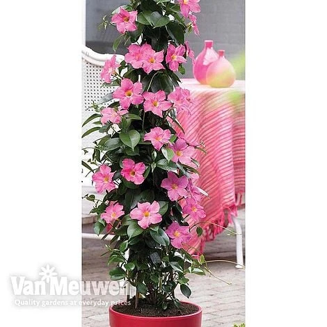 Pot up and grow Mandevilla plants on in warm, frost-free conditions until they are well grown. Once all risk of frost has passed, transplant them into their final positions in patio containers, a greenhouse or conservatory, making sure to maintain a minimum temperature of 10°C (50°F). Grow Mandevilla in full sun, with some shade from intense heat under glass. Use soil based compost such as John Innes No. 3 when planting into containers. Plant Mandevilla at the base of a suitable support such as trellis or climbing frames. Caution: Sap is an irritant to skin and eyes, all parts are harmful if eaten.