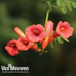 Exotic, glowing crimson blooms adorn this tropical evergreen climber. Flowering throughout the summer, Mandevilla ‘Bloom Bells® Red’ makes a wonderful addition to the patio where it will add height and jewel-like colour. Mandevillas love a hot sunny position – ideal for the patio, greenhouse or conservatory. Grow them in large containers that can be moved indoors to offer winter protection. Height: 1.8m (6′). Spread: 50cm (20″). Supplied in a 7cm pot.